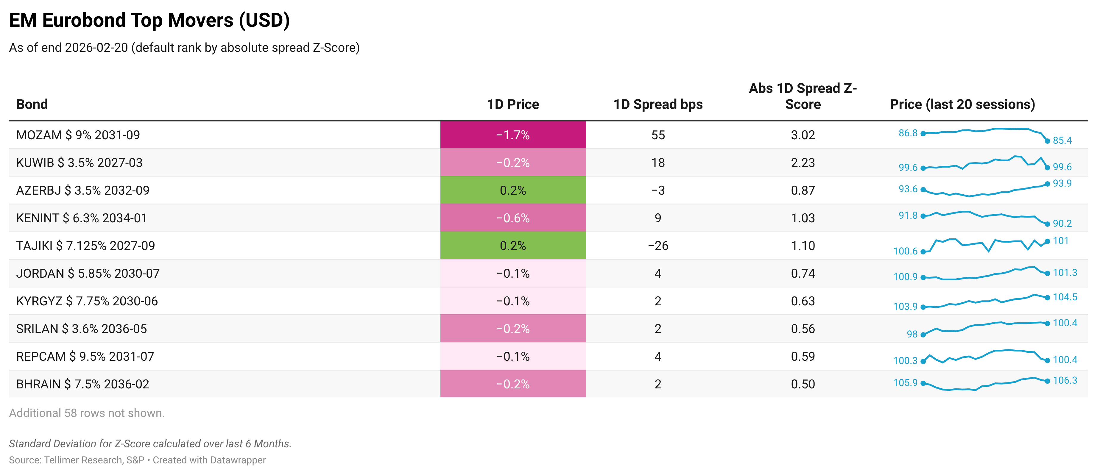 EM eurobonds were broadly flat on Friday, with median spreads across our sample widening by 1bp, while the US 10-year yield held steady at 4.09%. The S&P 500 rose 0.7% after the Supreme Court rejected Trump’s emergency tariffs, a decision that had been largely priced in, limiting market reaction. However, uncertainty remains over the next steps. Trump subsequently announced 10% global tariffs for up to 120 days on Friday, increasing the rate to 15% on Saturday.