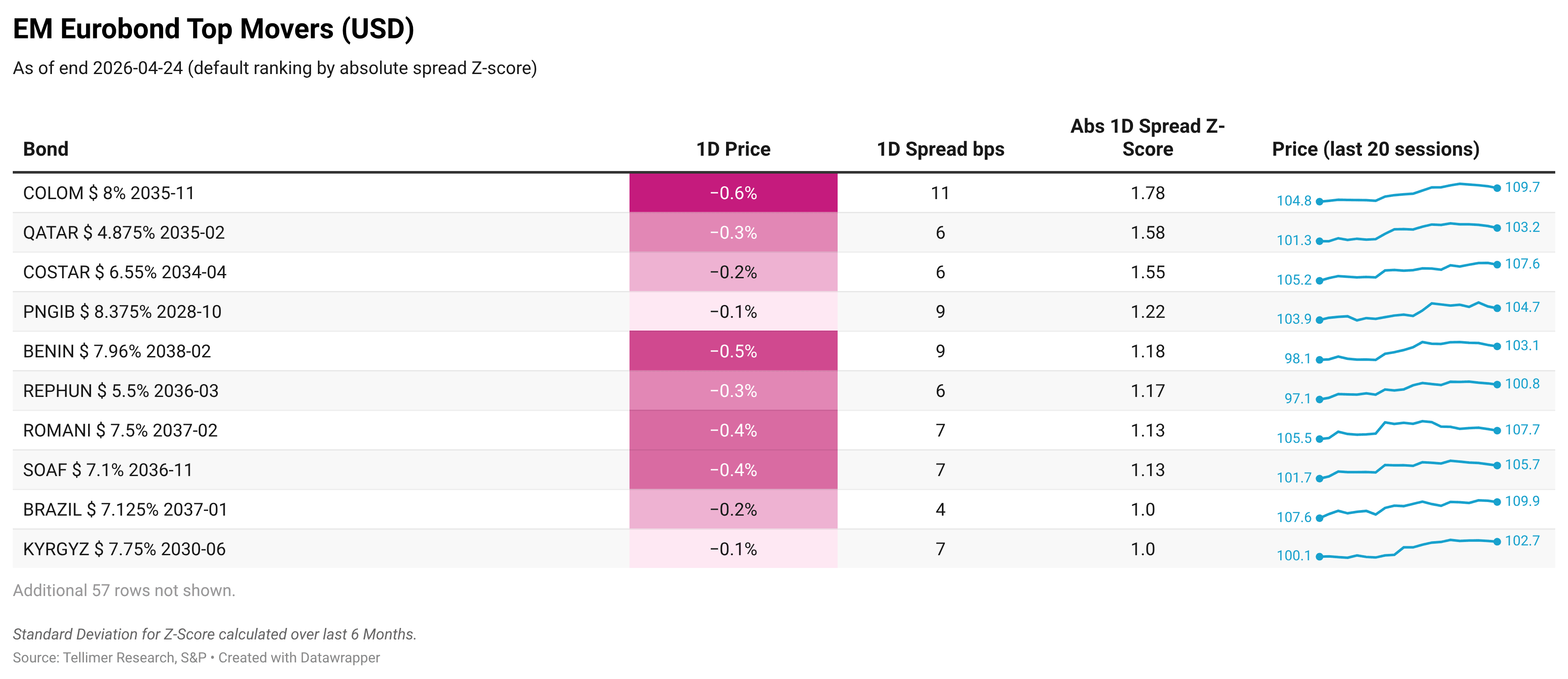 • Bolivia 2030s +0.5%; IMF optimism supports bonds, but fuel shortages and gold weakness pose risks