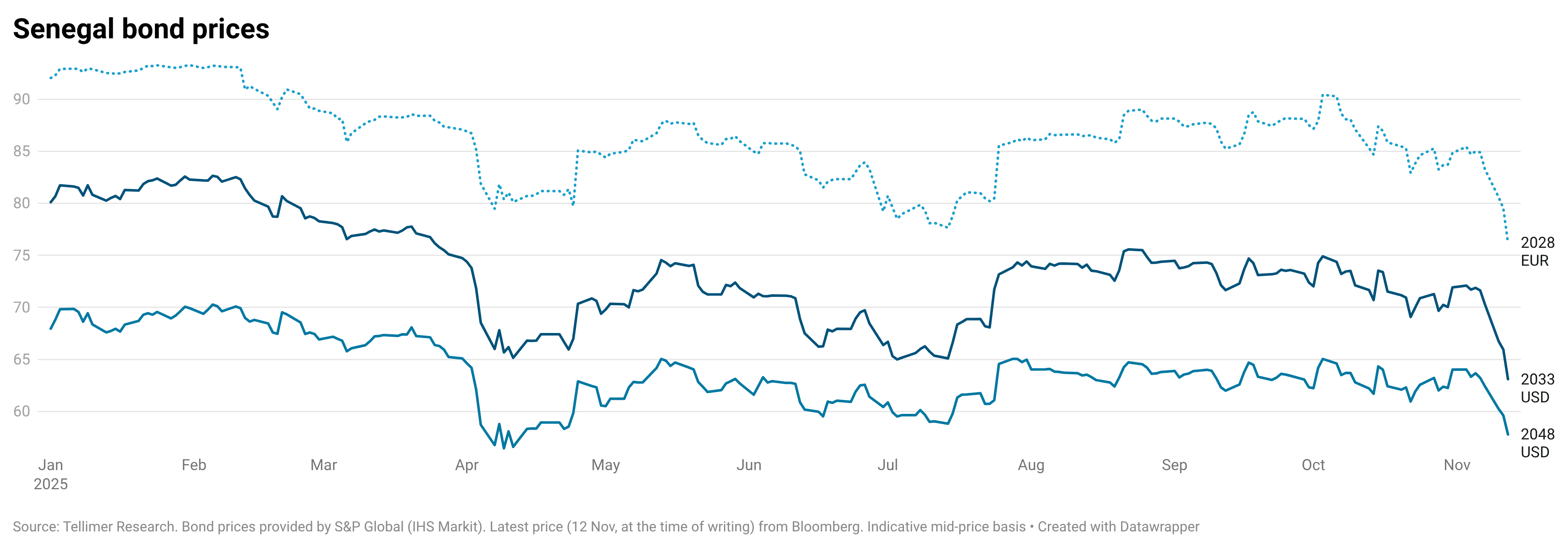 It's been a bad week for Senegal's bonds. Local reports this week of a political rift between President Faye and Prime Minister Sonko follow restructuring talk over the weekend, leaving the bonds sharply down across the curve. The '33s have fallen by 8pts since last Thursday's close to their lowest level not only this year but since they were issued eight years ago.